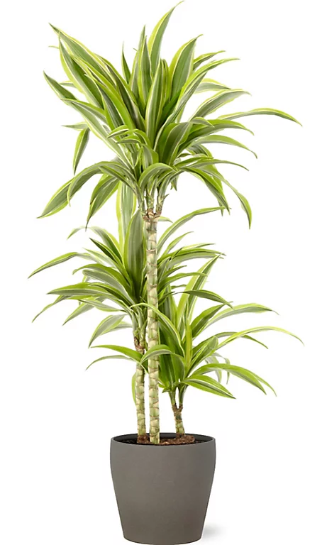 | Conseils d'entretien | Le Dracaena n'aime pas être en plein soleil mais apprécie les endroits bien éclairés où il conserve la beauté du dessin de sa feuille. N'arroser que lorsque la motte commence à se déshydrater et éviter les bains de pieds. Vaporiser de temps en temps. Au printemps et en été, ajouter de l'engrais une fois toutes les six semaines, jamais en automne et en hiver. Le Dracaena ne supporte pas le froid et la température ne doit pas tomber sous les 10 à 13°C. Bon à savoir: Le dracaena est toxique pour les enfants et les animaux domestiques. |